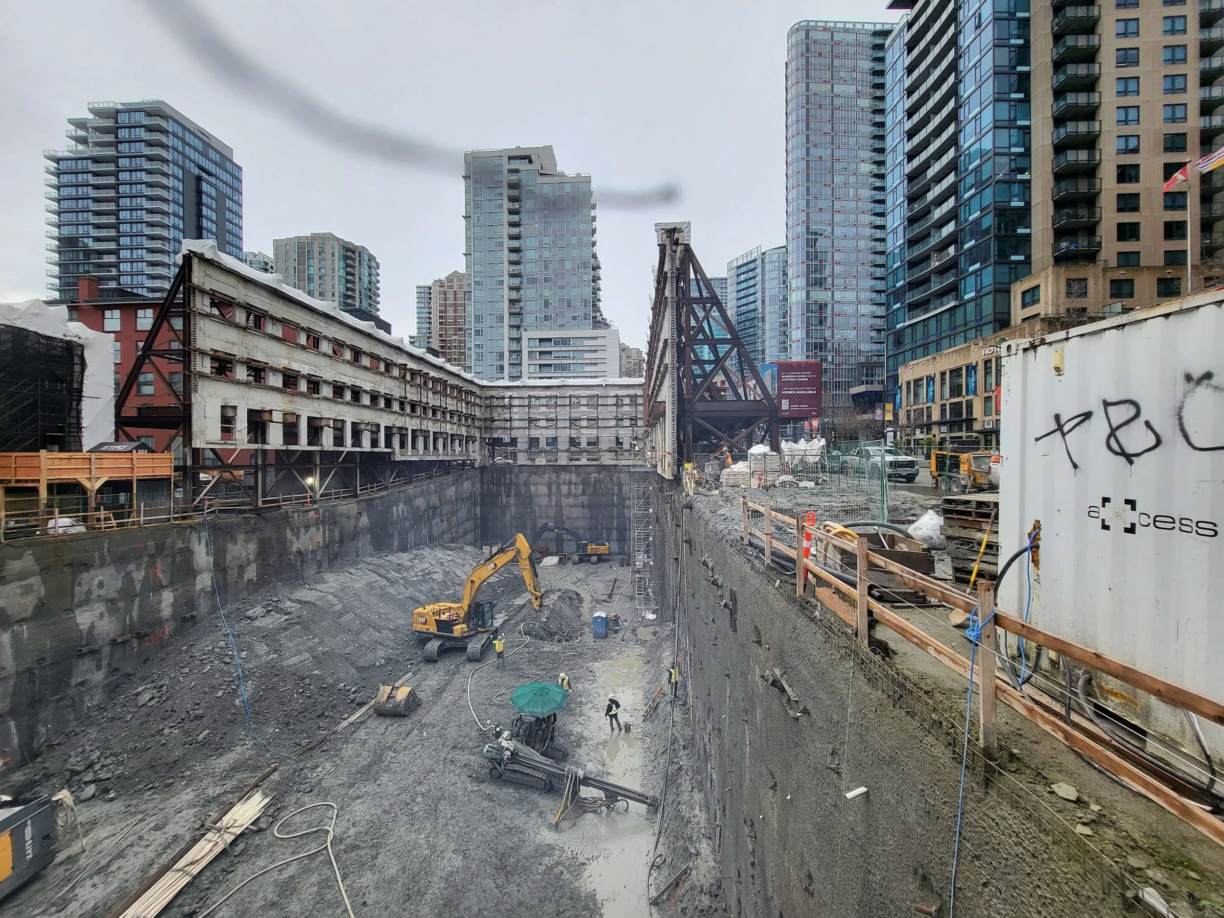 The project demanded precision steelwork and engineering to ensure the structural integrity of the retained facades, with all work completed to meet the City of Vancouver's heritage preservation requirements.