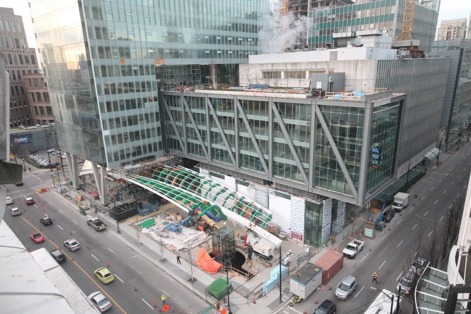 The five-storey glass office bar truss was supported at one end with modular falsework and the main truss connections were field welded. To install part of the spine under the multi-storey tower, KWH devised a custom sliding system as overhead craning was not possible in that area.